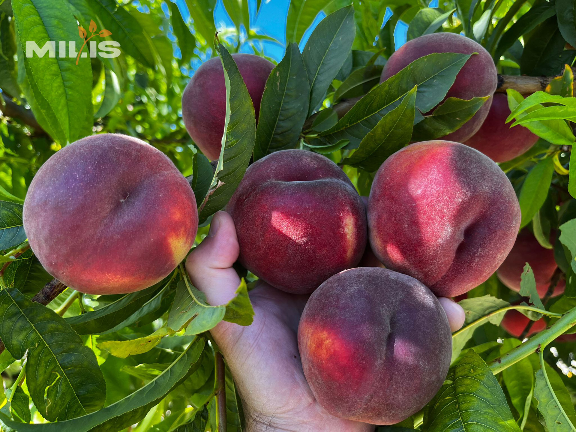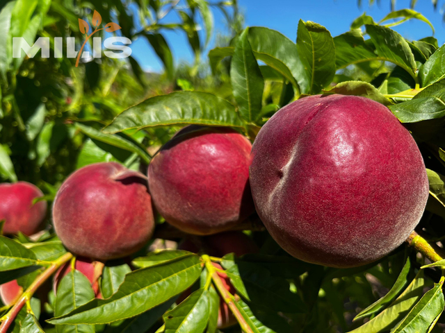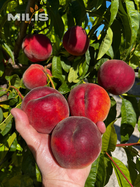 Round shape, 100% red skin. Caliber A–AA. Very good firmness, no cracking